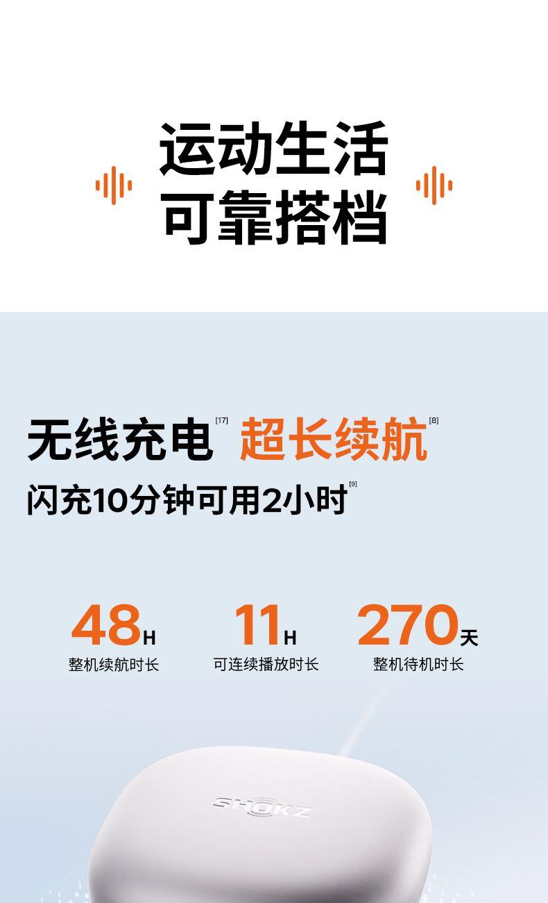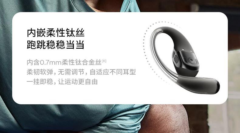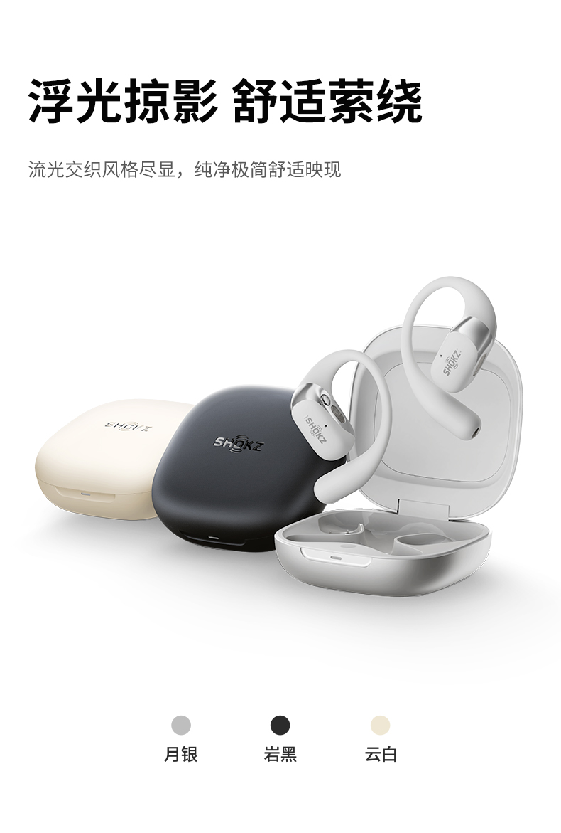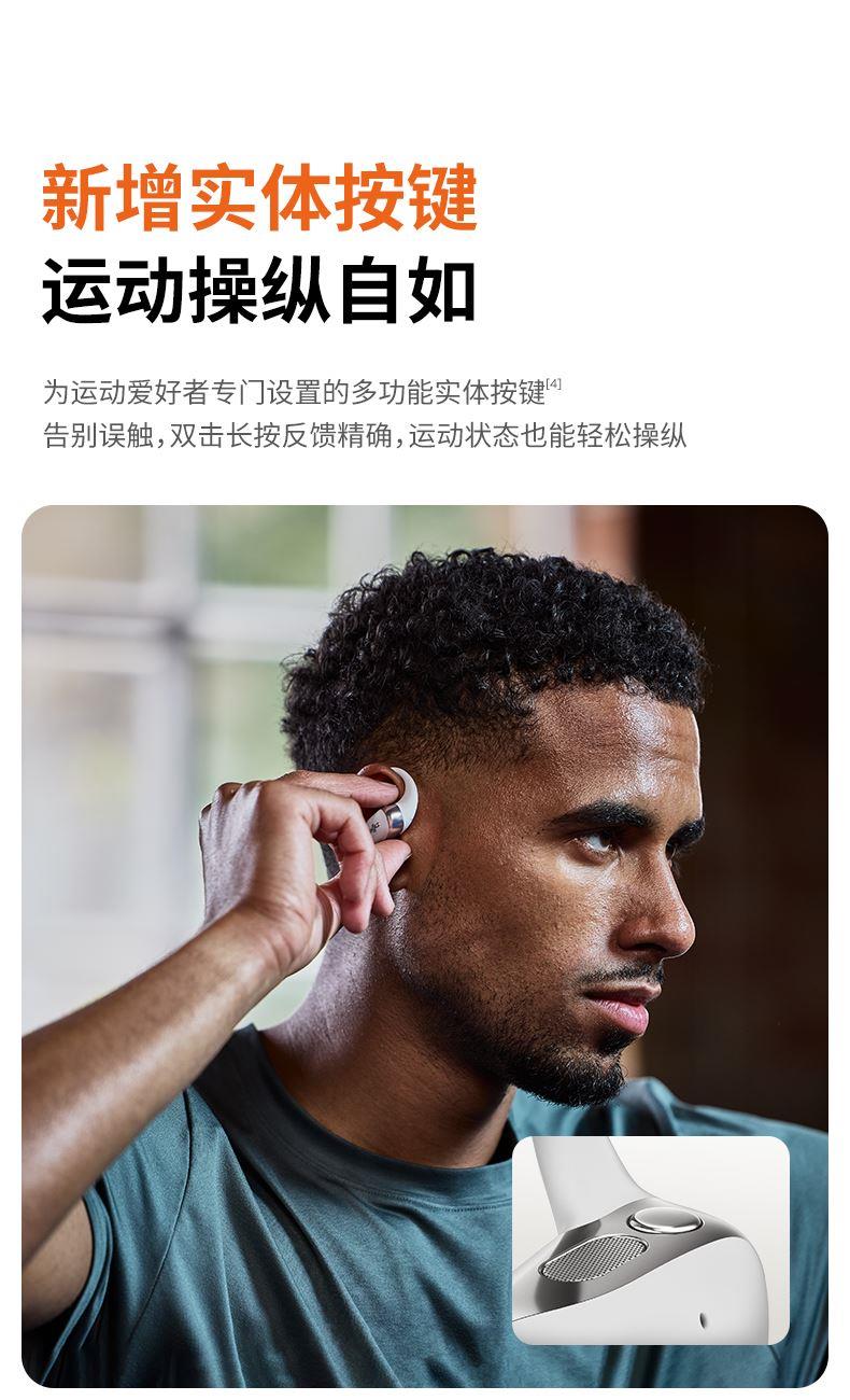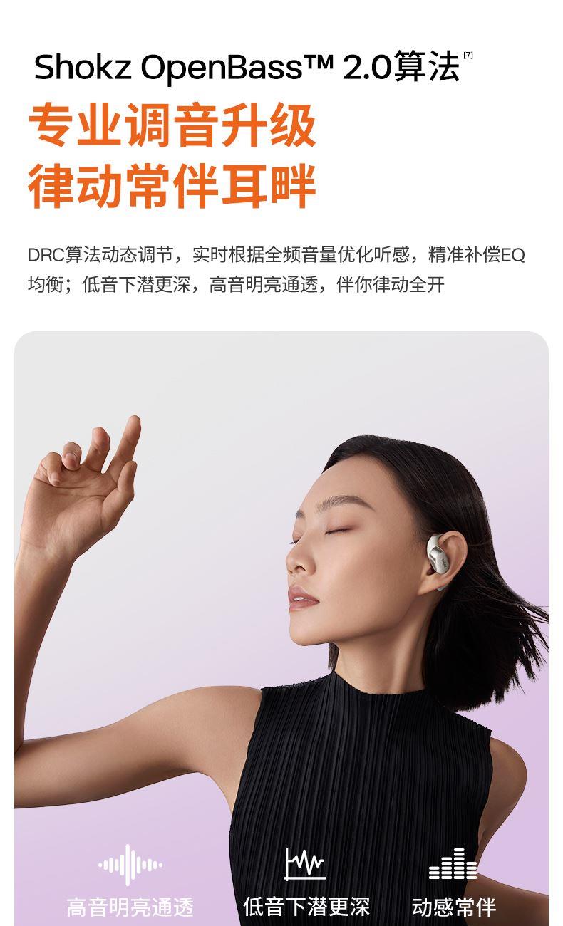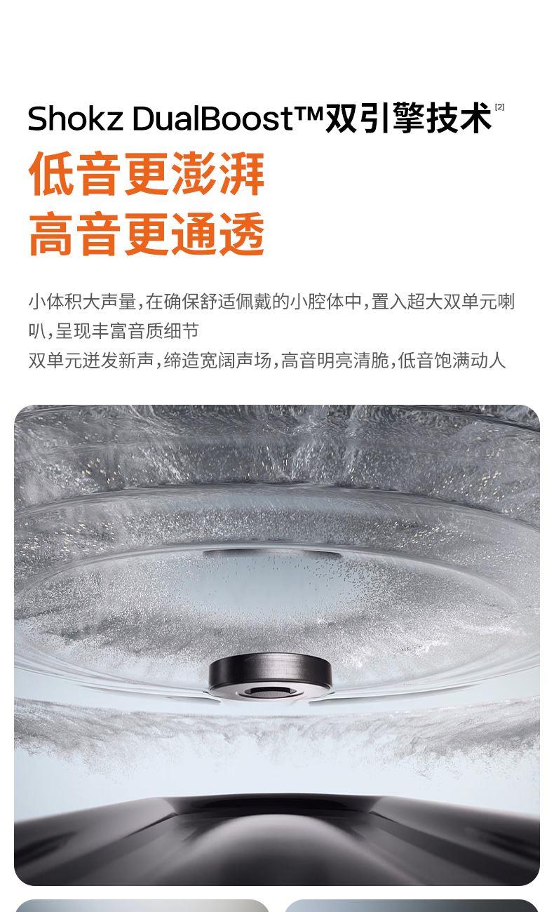 規(guī)格參數(shù): 系 列:健身徒步系列 商品毛重:71.8g 連接方式:藍牙 佩戴方式:掛耳式、不入耳式 類 別:運動耳機 產(chǎn) 地:中國大陸 顏 色:黑色、暖白 功能特點: 1、海豚弧耳掛,大小耳皆兼容 2、新一代超零度硅膠,全面體貼耳朵 3、48小時超長整機續(xù)航,10分鐘閃電快充 4、多功能實體按鍵 5、IP55級抗汗抗雨 6、Shokz DualBoost?雙引擎技術(shù),迸發(fā)新聲