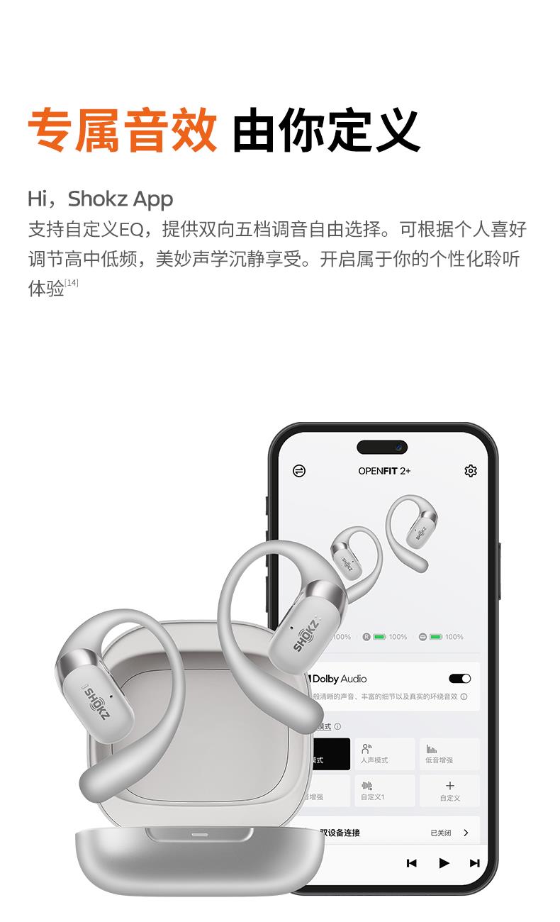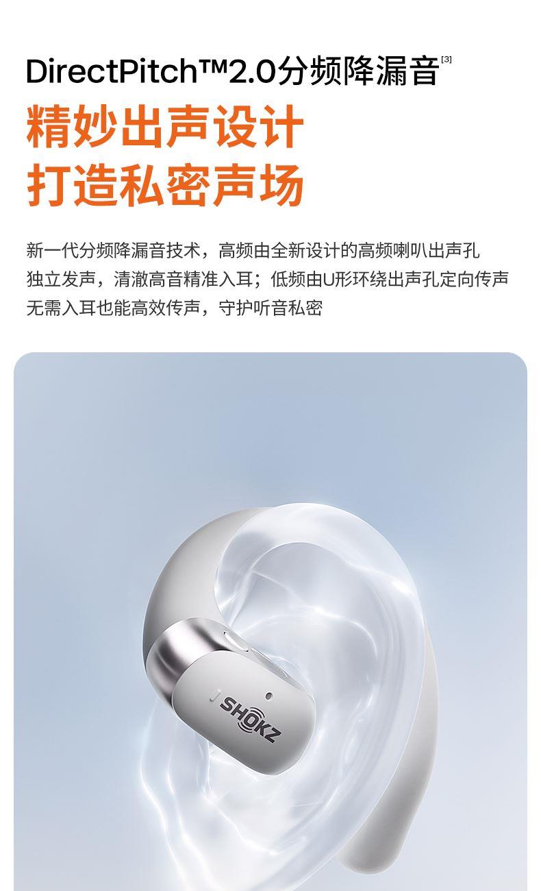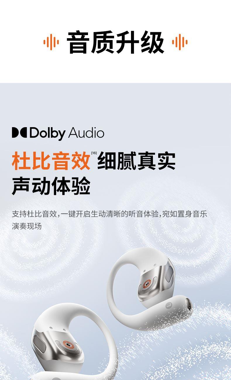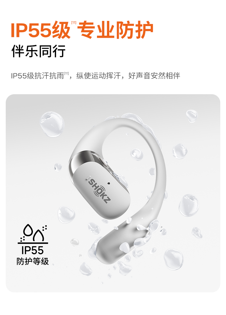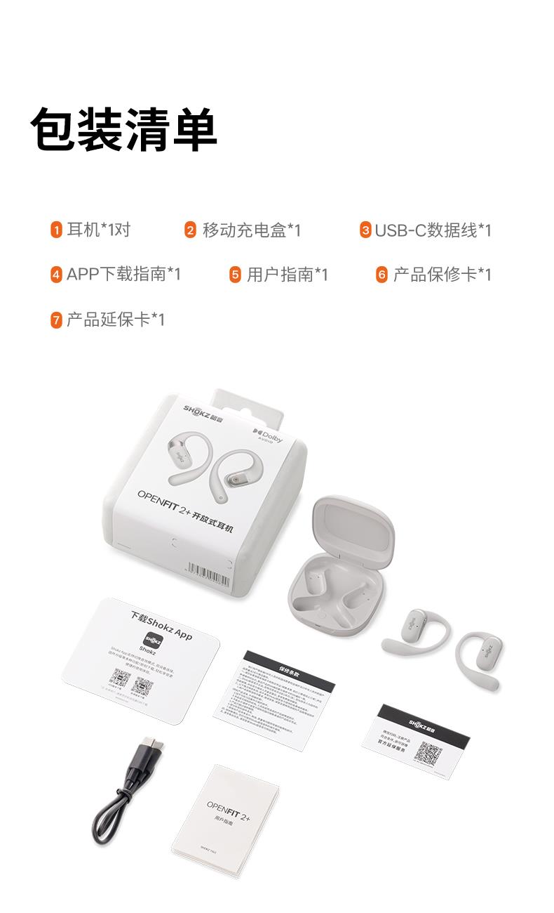 規(guī)格參數(shù): 系 列:健身徒步系列 商品毛重:71.8g 連接方式:藍牙 佩戴方式:掛耳式、不入耳式 類 別:運動耳機 產(chǎn) 地:中國大陸 顏 色:黑色、暖白 功能特點: 1、海豚弧耳掛,大小耳皆兼容 2、新一代超零度硅膠,全面體貼耳朵 3、48小時超長整機續(xù)航,10分鐘閃電快充 4、多功能實體按鍵 5、IP55級抗汗抗雨 6、Shokz DualBoost?雙引擎技術(shù),迸發(fā)新聲